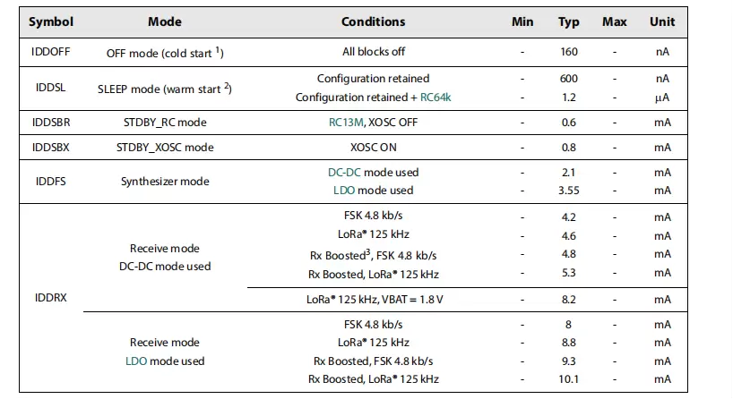 Die obige Tabelle zeigt den Stromverbrauch des drahtlosen HF-Moduls LoRa1262/1268 und gibt zwei Energieverwaltungsmodi an: LDO und DC-DC.