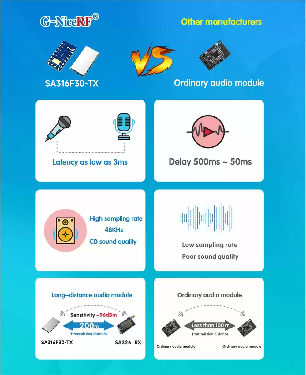 SA316 ist ein von NiceRF entwickeltes Audioübertragungsmodul für die Übertragung über große Entfernungen. Mit einer Audio-Abtastrate von 48K und einer Übertragungsentfernung von bis zu 200 Metern erfüllt es ein breites Spektrum an Benutzeranforderungen. Um die Übertragungsentfernung weiter zu erweitern, hat NiceRF den SA316F30 eingeführt. Diese verbesserte Version behält die gleiche Abtastrate von 48K und die gleiche Empfindlichkeit von -96 dBm bei, erweitert jedoch die Übertragungsentfernung deutlich auf 1500 Meter.