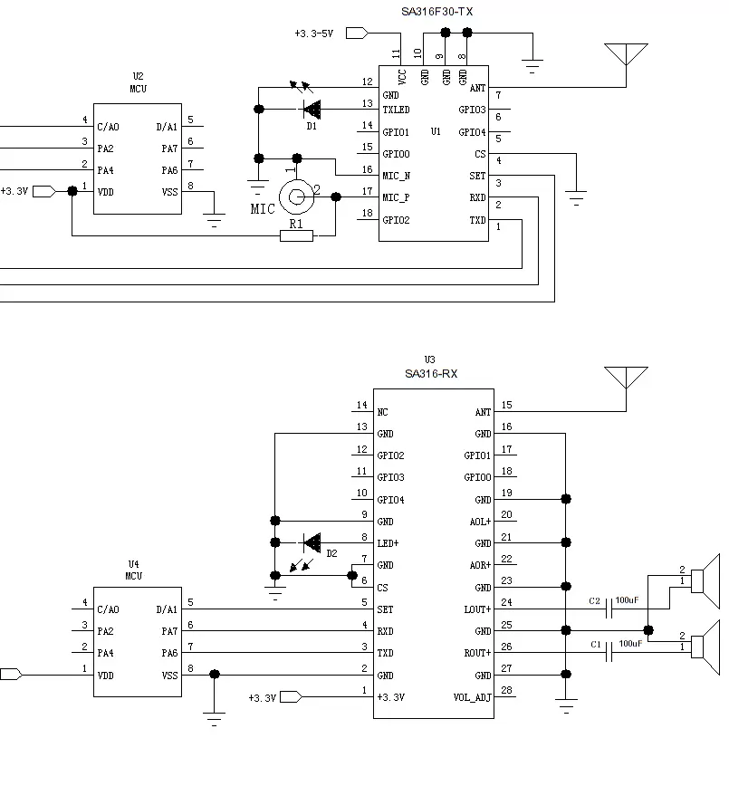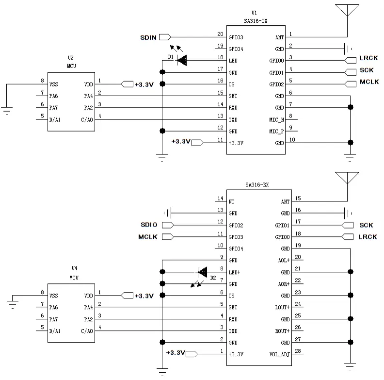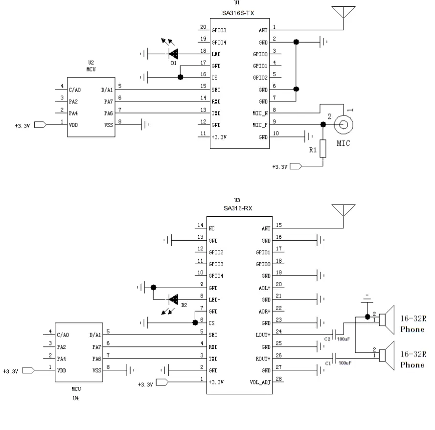Die Produkte der SA316S-Serie sind in die Sendermodule SA316S-TX und SA316F30 sowie das Empfängermodul SA316S-RX unterteilt. Diese Serie verwendet einen hochwertigen drahtlosen Sprachübertragungschip. Sie unterstützt externe PCM/IIS-Dual-Mode-Digital-Audioschnittstellen und bietet Kunden eine standardisierte serielle Schnittstelle. Anwender können Transceiver-Frequenz, Lautstärke, Mikrofonverstärkung und weitere Parameter des Moduls schnell und einfach über serielle Schnittstellenbefehle einstellen. Dies wird häufig in Situationen eingesetzt, in denen hohe Klangqualität erforderlich ist.